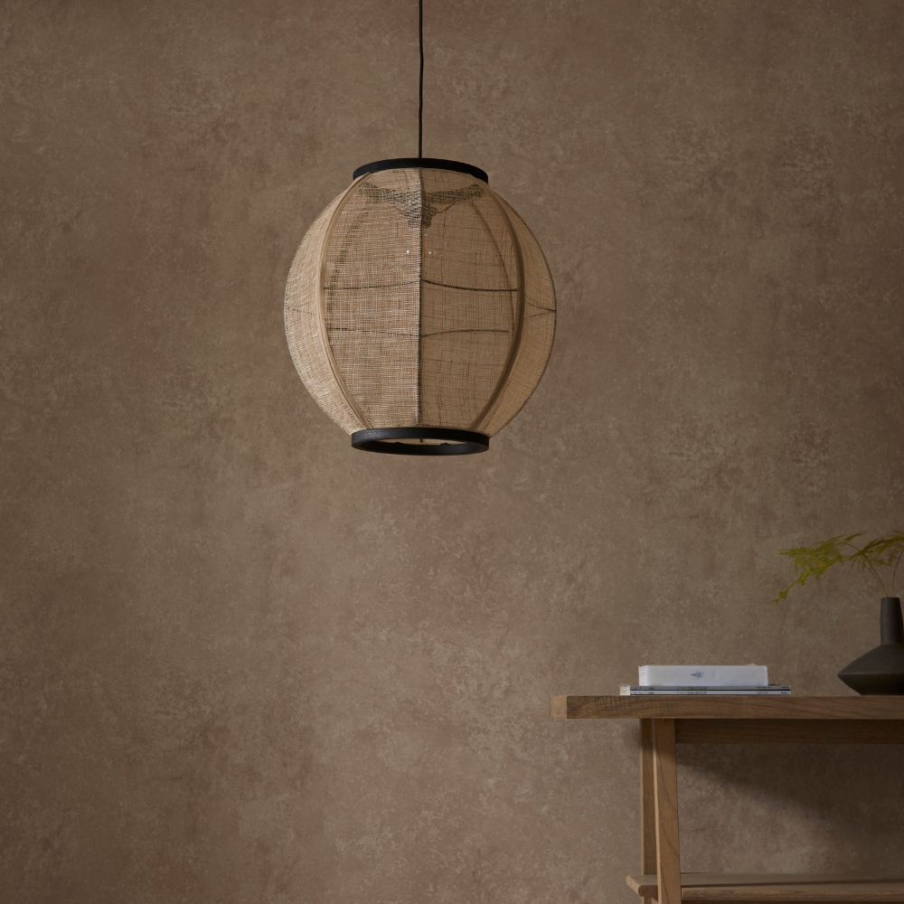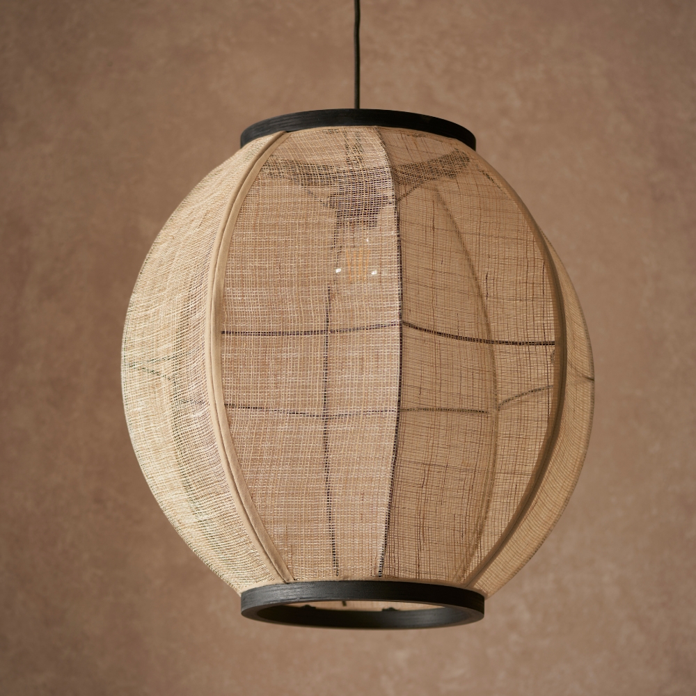 Take your interiors back to nature with this handmade wood and natural linen collection; a large pendant perfect for bringing an organic texture and warming ambience into your home. Other family items available.
