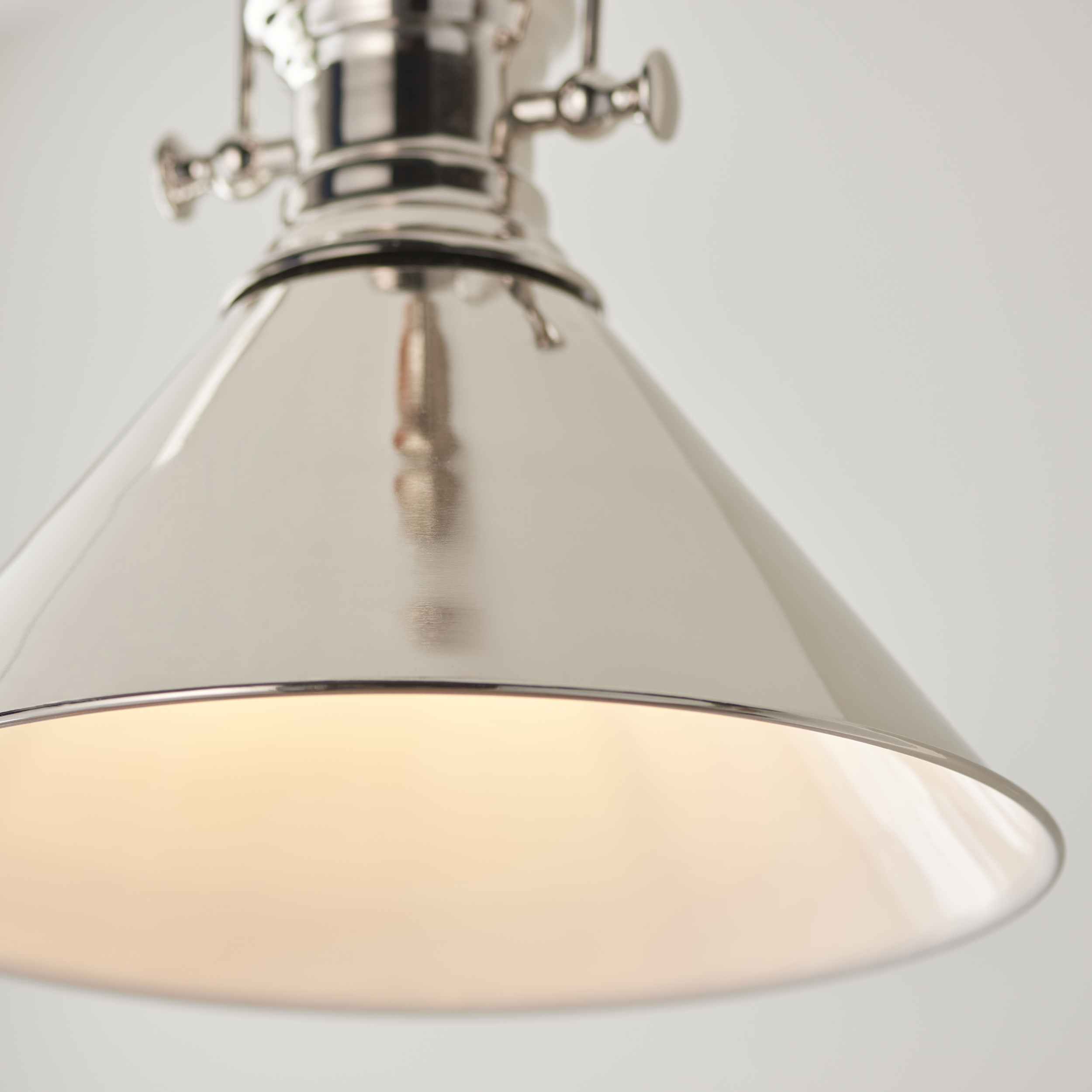 High quality, minimalistic pendant finished in bright nickel and white paint. Suspended by a height adjustable black braided cord. Perfect when paired with LED filament lamps to create striking light patterns.